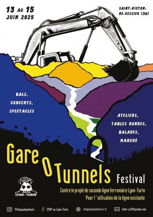 La première édition du festival Gare’O’Tunnels’ organisé du 13 au 15 juin 2025 à l’initiative de l’inter-collectifs mobilisé contre la ligne à grande vitesse Lyon-Turin et qui aspire à se pérenniser comme un rendez-vous bi-annuel régional de convergence.