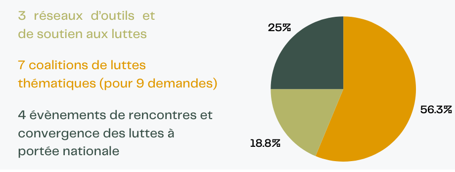 Les coalitions et inter-collectifs de luttes Stop Croisières, les luttes forestières coalisées à suite à l’appel pour des forêts vivantes, le Nuage sous nos pieds contre les Infrastructures numériques, Rester sur terre contre les extensions aéroportuaires, l’Hydre des luttes pour l’eau, la Coordination Photorévoltée, celle pour des Jardins populaires, des Naturalistes des Terres, de la Déroute des Routes, RAFU contre les fermes usines, L’inter-Bassines Non Merci, les intercollectifs LGV non-merci et Intercollectifs contre le Lyon Turin, l’intercollectif Stop Micro, le réseau de soin Support & Recovery ou celui des Mutin-es ont pu ainsi se réunir lors de temps intercollectifs de convergence et de structuration.