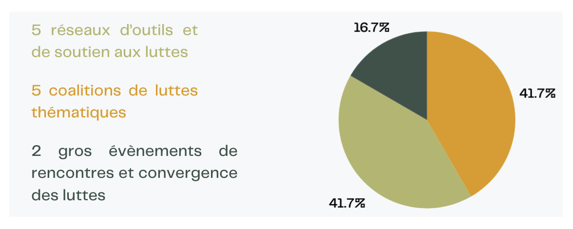 Si l’objectif initial et primordial durant ses deux premières années d’existence, était pour le Fonds de soutenir des coalitions de lutte contre des projets nuisibles à l’environnement et imposés aux populations locales, depuis l’année passée, la gouvernance s’est étendue à ceux et celles qui font soutien aux luttes dans leur action, ce que nous avons appelé les réseaux outils ou de soutien, qui nourrissent, apportent un soutien logistique, soignent et épaulent les collectifs dans leurs action quotidienne et leur permettent de durer.