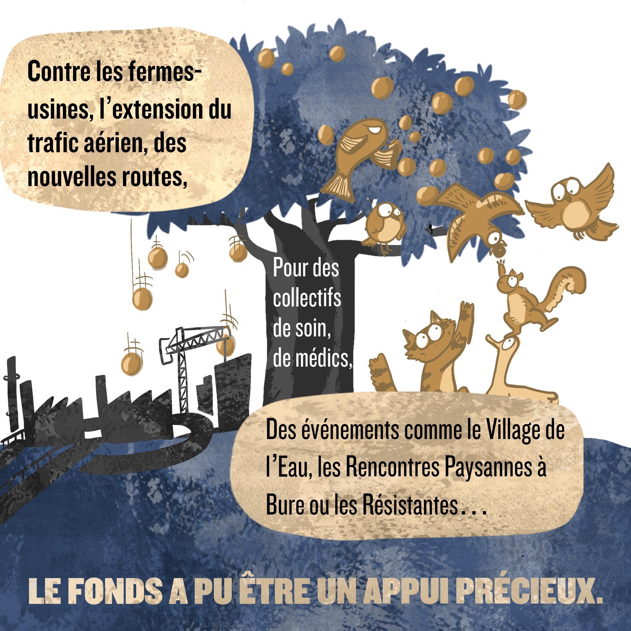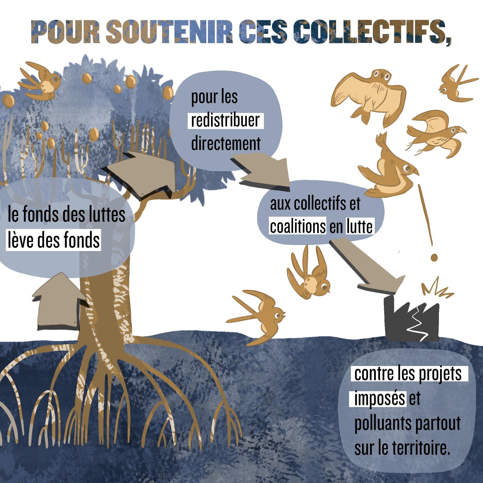 Le Fonds des luttes, créé à l’impulsion de l’association Terres de luttes, vise à lever des fonds pour les redistribuer directement aux collectifs et coalitions en lutte contre les projets imposés et polluant partout sur le territoire.