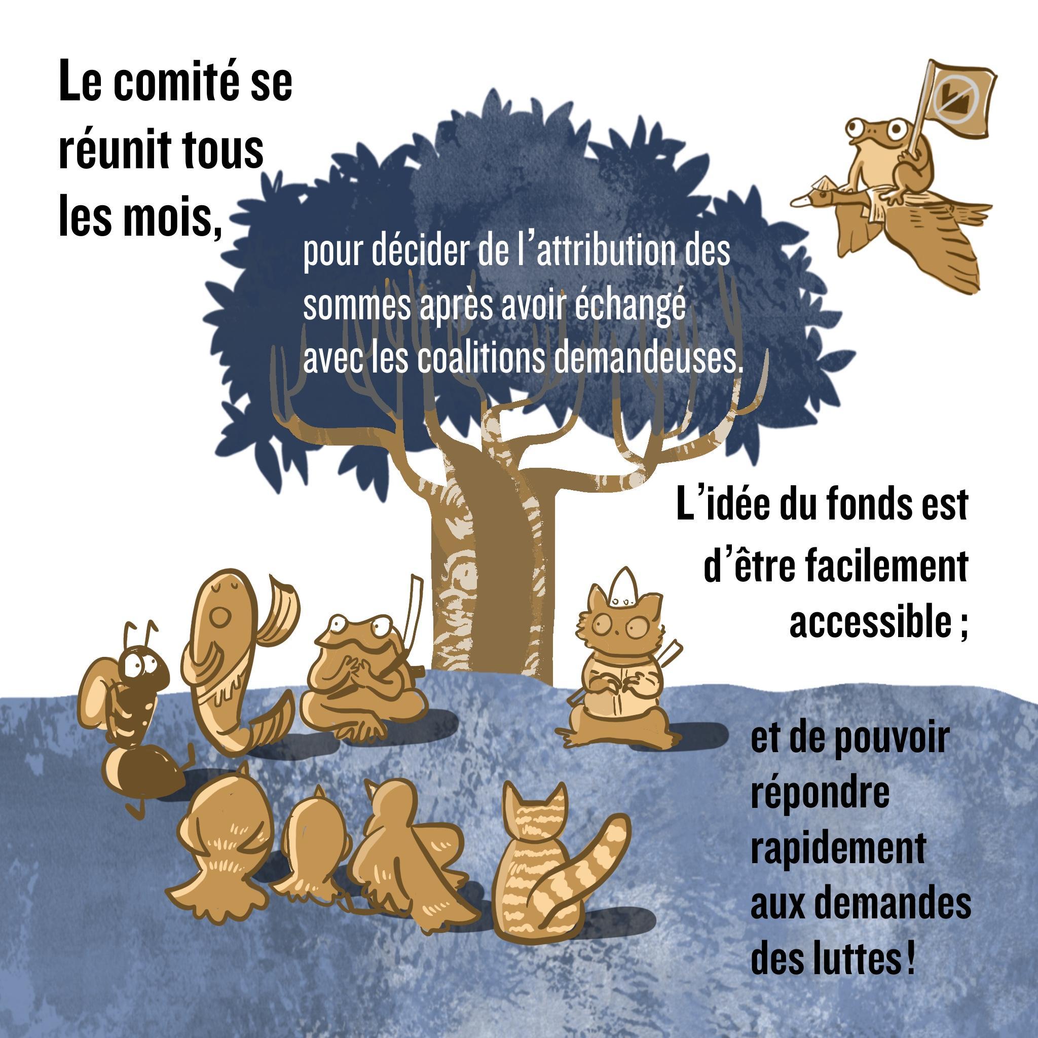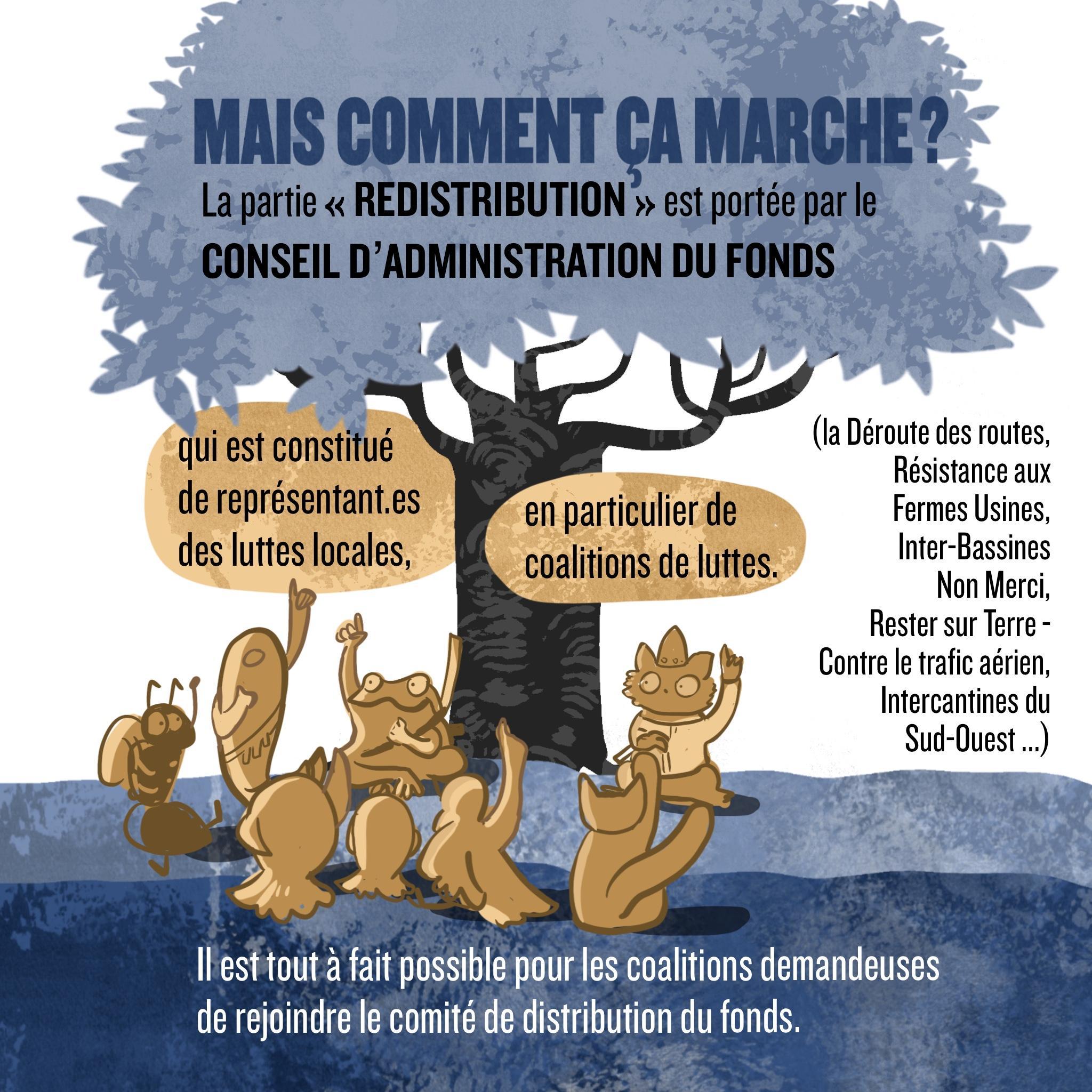 La « redistribution » des fonds collectés est prise en charge par le conseil d’administration du fonds qui est constitué de représentant.es des luttes locales, en particulier de coalitions de luttes, et de personnes ressources dont l’expérience et les compétences leur permettent d’être légitimes dans l’action de redistribution des fonds aux mobilisations des luttes.